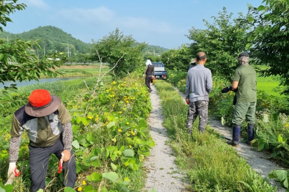 장동면에서는 직원 및 지역사회단체, 장평면 지역사회단체와 합동으로 15일 칡넝쿨 및 지주대 제거, 16일에는 풀베기 작업을 실시했다.