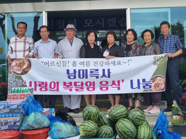 기탁식에는 새마을부녀회장을 비롯한 이장단장, 주민자치위원장, 발전협의회장 등 7명이 참석해 가뭄과 물가상승으로 어려운 시기에 복달임 음식으로 어르신들의 건강을 기원해주신 남미륵사 법흥 스님에게 존경과 감사의 마음을 전했다.
