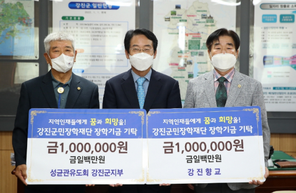 [남도저널 양용숙] 지난 20일 강진향교와 성균관 유도회 강진군지부가 각 100만 원의 장학금을 강진군민장학재단(이사장 강진원)에 기탁했다.
