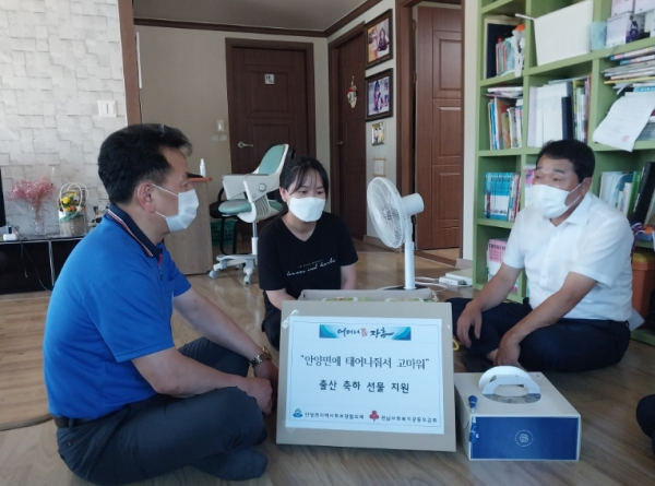 [남도저널 양용숙] 장흥군 안양면 지역사회보장협의체에서는 26일 출산의 기쁨을 함께 나누기 위해 출산가정을 방문해 축하 선물(기저귀, 물티슈 등)을 전달했다.