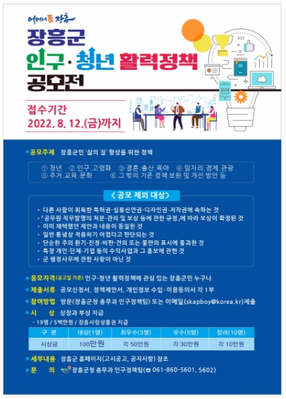 [남도저널 양용숙] 장흥군 오는 8월 12일까지 인구청년 활력정책 아이디어 공모전을 연다.
