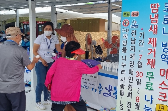 [남도저널 양용숙] 전남지체장애인협회 장흥군지회는 제15회 정남진 장흥 물축제 행사(7월 30일 ~ 8월 7일) 기간 중에 편의시설 부스 자원봉사를 통해 거동이 불편한 방문객에게 휠체어 대여 서비스를 제공했다.