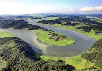 들판과 산을 휘감고 돌아가는 강줄기며 강변 풍경은 한 폭의 그림처럼 아름답다.