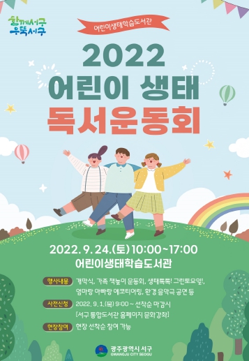 [남도저널 김용범 기자] 광주 서구가 오는 9월24일 어린이생태학습도서관과 풍암생활체육공원에서 ‘2022 어린이 생태 독서운동회’를 개최한다.