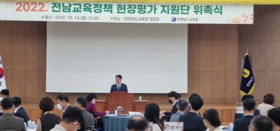 [남도저널 박기철 기자] 전라남도교육청이 10월 14일 청사 2층 대강당에서 전남교육정책 현장평가 지원단 57명에 대한 위촉식을 갖고, ‘함께 만들어가는 전남교육대전환’정책에 대한 현장 모니터링을 시작했다.