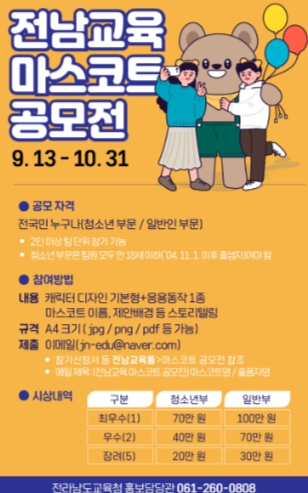 전남교육을 표현할 수 있는 독창적이며 친근한 캐릭터의 디자인과 해당 캐릭터에 대한 스토리텔링을 주제로, 국민 누구나 참여할 수 있다. 청소년과 일반인 2개 부문으로 운영되며, 팀 또는 개인으로 응모 가능하다. 청소년 부문은 팀 구성원 모두가 만 18세 이하(2004년 11월 1일 이후 출생자)여야 한다.