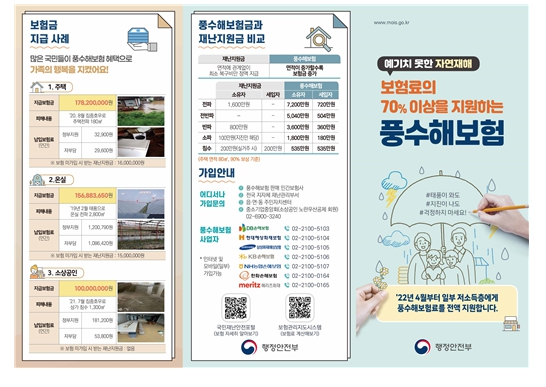 ‘풍수해보험’은 태풍ㆍ호우ㆍ대설ㆍ지진 등 자연재해로 발생하는 재산 피해를 보상해주는 정책보험으로서 전체 보험료의 일부를 정부와 지자체에서 지원해 저렴한 보험료로 가입이 가능하며, 가입 대상별로 최소 70%에서 최대 92% 차등 적용해 지원된다.