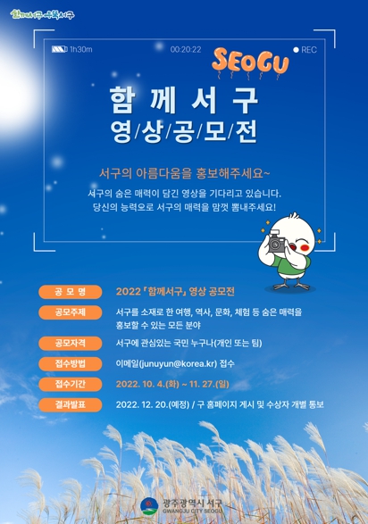 김이강 서구청장은 “2022년 '함께서구 영상공모전'을 통해, 시민들이 제작한 서구의 아름답고 재미있는 영상 콘텐츠를 발굴하고 공유하는 과정을 통해 서구의 숨은 매력을 알 기회가 되기를 기대한다”라고 말했다.