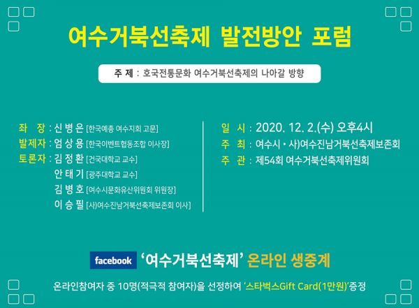 이번 포럼은 여수시와 여수진남거북선축제보존회가 포스트코로나 시대, 나아가 2021년 55회를 맞는 거북선축제의 백년을 준비하기 위해 마련한 자리로 본래 대면행사로 계획했으나 코로나19 여파로 비대면 온라인 생중계로 변경했다.