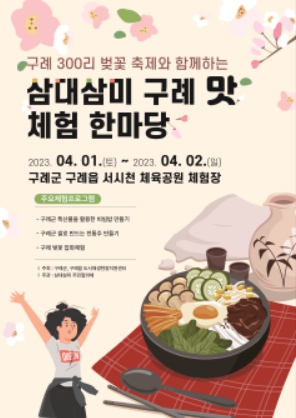 [남도저널 김종민 기자] 전남 구례군은 ‘구례300리 벚꽃축제와 함께하는 삼대삼미 구례 맛 체험 한마당’을 4월 1일부터 4월 2일까지 서시천 주무대 뒤쪽 체험존에서 운영 한다고 밝혔다.