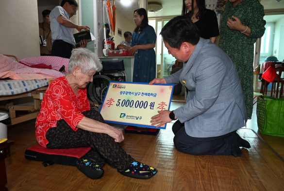 [남도저널 이운현 기자] 김병내 광주 남구청장이 효를 실천하는 사회적 분위기 장려를 위해 전국 최초로 관내 최고령 어르신에게 천세축하금 등을 전달하며 무병장수를 기원했다.