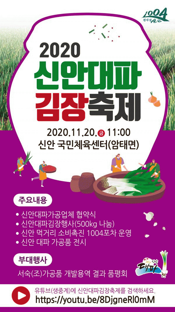 [남도저널] 김용범 기자 = 신안군은 올해 처음으로 추진한 2020 신안대파 김장축제를 코로나19 확산방지를 위해 온라인 생중계 방식으로 오는 20일 11:00 ~ 12:00까지 진행한다고 밝혔다.