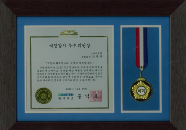 [남도저널 김용범 기자] 국회 교육위원회 소속인 강득구 의원(더불어민주당, 안양만안)이 더불어민주당이 선정한 ‘2023 국정감사 우수의원상’을 수상했다. 강득구 의원은 제21대 국회에서 3년 연속 국정감사 우수의원에 선정됐다.