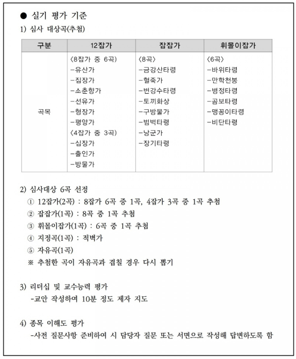 발표에 따르면, 12잡가는 유산가를 포함한 12곡 중에서 2곡, 잡잡가 8곡 중에서 1곡, 그리고 휘몰이잡가 6곡 중에서 1곡을 추첨을 통해 선정하며, 지정곡으로는 '12잡가' 중 '적벽가'를, 응시자가 선택하는 자유곡 1곡을 포함하여 총 6곡을 심사 평가 대상곡으로 구성했다.