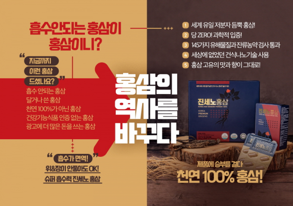[남도저널 김용범 기자] 한국을 대표하는 전통 건강식품인 홍삼이 첨단 나노 기술과 만나 주목받고 있다. 진세노 홍삼은 순수한 한국산 6년근 홍삼을 한국의 최첨단 건식나노기술을 통해 천연의 맛과 영양, 향을 그대로 유지하는 데 성공했다.