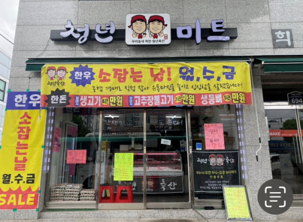 A 안녕하십니까. 청년미트 정육점을 운영 중인 33살 서동욱입니다. 가게는 수원시 권선구 고색동에 있으며 월, 수, 금 한우 소 잡는 날로 항상 신선한 고기와 친절한 서비스를 위해 노력하고 있습니다.