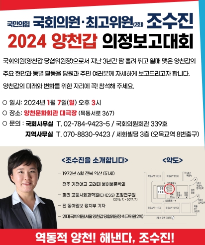 [남도저널 김용범 기자] 국민의힘 서울 양천갑 당협위원장인 조수진 국회의원이 2024년 1월 7일 오후 3시 양천문화회관 대극장에서 '양천갑 의정보고대회'를 개최한다.