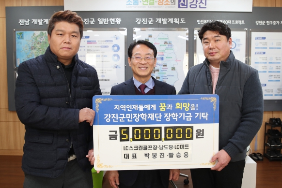 [남도저널 양용숙 기자] 강진군 강진읍 LC마트·남도탕·LC스크린골프장 황승용·박봉진 대표가 500만원, LG전자 베스트샵 정종훈 대표가 300만원을 강진군민장학재단에 지난 11일 각각 기탁했다.