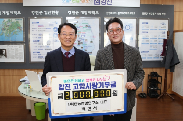 [남도저널 양용숙 기자] 새해를 맞아 고향사랑기부 행렬이 이어지고 있는 가운데 (주)현농경영연구소 백민석 대표가 최근 강진군에 200만원을 기부했다.