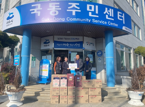 [남도저널 김영도 기자] 여수시 국동에 소재한 미래연합의원과 전 국동주민자치위원장(최상철)이 지난달 설 명절을 맞아 생활용품 80세트(200만원 상당)를 국동주민센터에 전달했다.