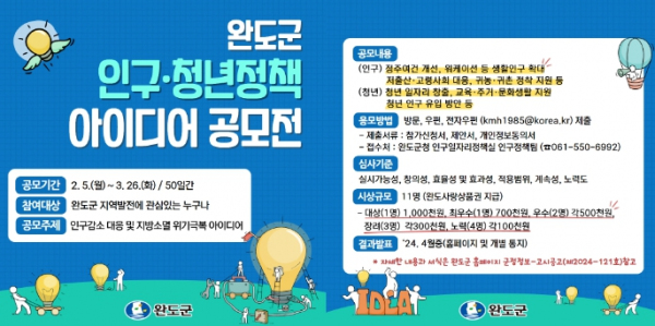 [남도저널 양용숙 기자] 완도군은 2월 5일부터 3월 26일까지 50일간 지방소멸 및 인구감소에 대응하기 위한 다양한 인구·청년 정책 아이디어를 공모한다.