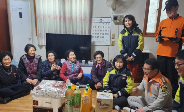 이날 소방서에서는 어르신들의 건강 체크, 건물 내 소화기 및 소방안전 점검 등 안전교육을 실시했으며, 장흥의용소방대에서는 경로당 환경 정리 및 생필품 등 위문품을 전달했다.