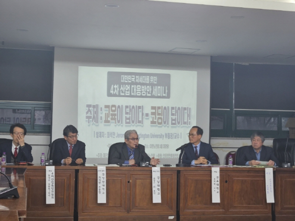주제발제에 이어서 패널 토론에서는 강남대학교 유양근 전 총장이 좌장으로 나와서 주제발제에 관한 내용을 전공한 연구자로서 최교수의 동료로서 코딩은 대한민국의 미래 비전을 이끌어 나아갈 가장 중요한 요소라고 밝혔다. 첫 번째 패널로 나선 본 세미나를 주최한 4차산업특별위원회 위원장 한대규 박사는 본 세미나 97회로써 정부와 국회 그리고 다양한 단체에서 최교수와 연구세미나를 진행한 경험을 바탕으로 대한노인회의 지역 엘리트 노인을 재교육하여 지역 아이들의 코딩교육에 최선을 다하겠다고 토론의 주제를 밝혔다. 마지막 패널로 나선 전주대학교 송재백 교수는 최교수의 주제에서 코딩교육은 선진국들이 소유물이라는 것을 알게 됐고 대한민국 미래를 지켜야 할 우리의 차세대 코딩교육이 절실하다는 것을 논했다. 그리고 송교수는 최교수가 언급한 대한민국이 e스포츠의 종주국이라는 사실을 인지하고 도시전문가로서 지역경제산업을 발전시키는 요소로써 e스포츠 산업을 지자체에서 적극 나서야 한다고 주장하면서 게임산업의 순기능인 e스포츠를 발전시키려면 게임산업의 역기능인 게임중독을 해결해야만이 대한민국이 e스포츠의 종주국으로써 면모를 지닐 수 있다고 주장했다.