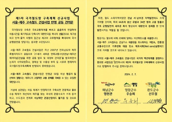 지난 완도·해남·영암 군수는 공동 건의문을 지난 2월 7일, ‘완도 경유 서울~제주 고속철도 건설 사업’ 공동 건의문을 전남도에 제출했다.