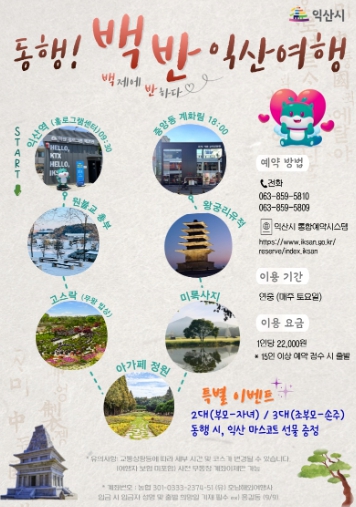 시 관계자는 "당일치기 익산 여행을 고민하는 관광객을 위해 준비한 관광 상품"이라며 "앞으로도 관광 매력 도시 익산을 조성하기 위해 최선을 다하겠다"고 말했다.