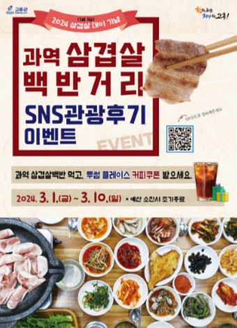 [남도저널= 구지영 기자]고흥군은 삼겹살 데이(3.3)를 맞아 3월 1일부터 10일까지 과역 삼겹살 백반거리 SNS 관광후기 이벤트를 진행한다고 밝혔다.