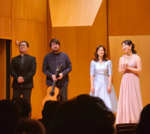 이번 음악회에 탁현욱 작품이 초연으로 두 곡이 연주됐는데 마지막으로 연주된 Baroque Fantasy for Soprano Harpsichord and Guitar를 먼저 설명한다. 피아노와 기타로 시작한 1악장 Tambourin에서 왼손으로 연타를 치는 하프시코드와 오른손의 저음과 고음의 넘나 들음은 시간과 공간을 초월하려는 꿈틀거림을 연상했다. „돌고 돈다“ 라는 키워드로 해설자 김주영은 “젊은 작곡가 탁현욱이 바라본 바로크를 눈여겨보라고“ 청취 레시피를 꺼냈다. 3악장 Aria 와 4악장 Fantasia는 성악이 도입되어 상승과 하강의 묘미, 공기층에 포화된 서로 다른 색을 음으로 꺼내 배열하듯이 직선과 곡선을 그렸는데 아르페지오와 순차적인 상행 하행의 곡선들이 점으로 흩어지고 모아졌다. 판타지아라는 부드러운 제목 속에 일침을 넣어 무언가를 명징하게 호소했다.