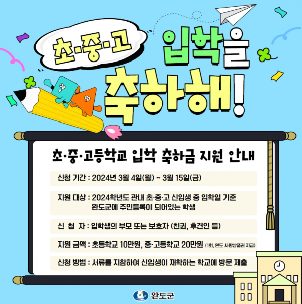 [남도저널 양용숙 기자] 완도군은 지난해에 이어 올해도 교육 공공성을 강화하고 보편적 교육 복지 실현을 위해 관내 초·중·고등학교 입학생에게 축하금을 지원한다.