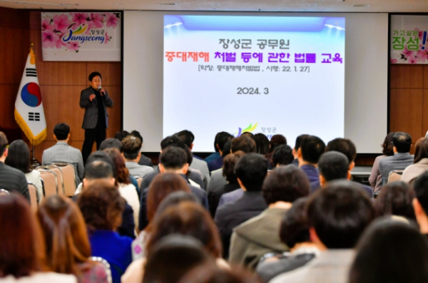 [남도저널 김종훈 기자] 장성군이 4일 군청 아카데미홀에서 군 공직자 대상 ‘중대재해처벌법의 이해와 대응방안’ 교육 시간을 가졌다. 3월 정례조회 이후 진행된 이번 강의는 ㈜인건설안전 마숭춘 대표가 맡았다.