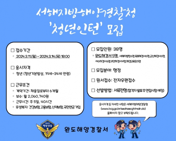 [남도저널 양용숙 기자] 완도해양경찰서는 오는 3월 11일부터 14일까지 공공부문 청년정책 활성화를 위해 청년인턴을 모집한다고 5일 밝혔다.