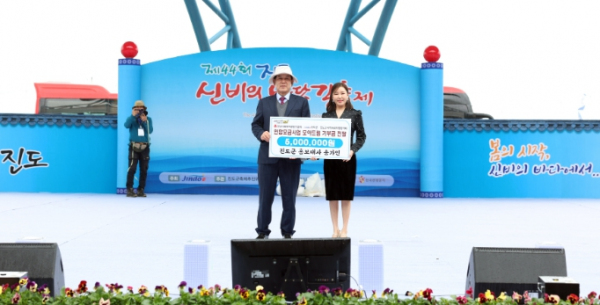 제44회 진도 신비의 바닷길 축제의 개막식 축하공연을 앞두고 무대에 올라 진도군에 기탁금을 전달하며 “언제 어디서나 항상 열렬한 성원을 보내주시는 내 고향 진도군민들의 사랑이 큰 힘이 된다”며 “받은 사랑을 다시 고향 진도의 어려운 이웃을 위해 되돌려 줄 수 있어 기쁘게 생각한다”고 전했다.