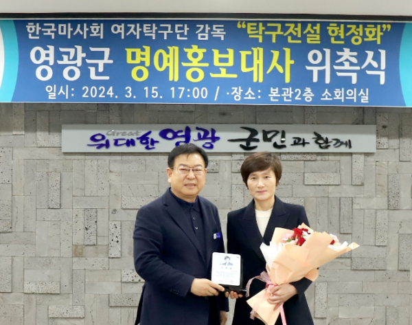 [남도저널 김종훈 기자] 영광군은 지난 15일 영광군청 소회의실에서 명예홍보대사 위촉식을 갖고 한국마사회 여자탁구단 감독 현정화를 영광군 명예홍보대사로 위촉했다고 밝혔다.