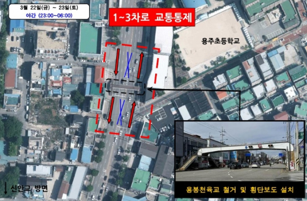 용봉천 육교는 지난 1998년 준공된 폭 3미터, 길이 24.7미터 규모의 도로시설물로 노후화로 인해 도심 경관을 저해할 뿐 아니라 아동․노인․임신부 등 교통약자가 통행하기 힘든 여건으로 육교 이용률이 현저히 감소 되어 철거를 요구하는 민원이 지속 제기되어 왔다.
