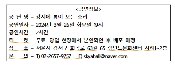 스카이아트홀은 오는 3월 26일 화요일 오후 7시, 첫 번째 기획공연인 “강서에 봄이 오는 소리”를 선보인다고 밝혔다.