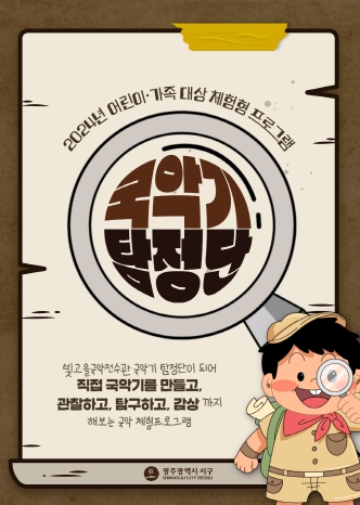 [남도저널 김홍열 기자] 광주광역시 서구는 3월부터 12월까지 빛고을국악전수관 전시실에서 어린이․가족 대상 체험형 프로그램 ‘국악기 탐정단’을 운영한다.