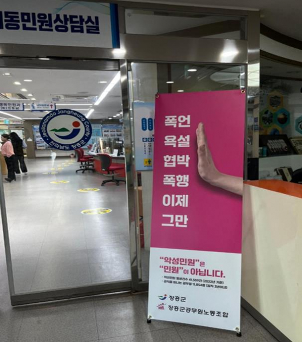 이에 발 맞추어 장흥군과 장흥군노동조합은 직원 보호를 위한 첫걸음으로 악성 민원 근절 베너를 설치했다.