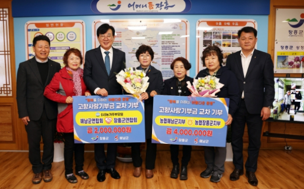 [남도저널 양용숙 기자] 장흥군은 25일 장흥군수실에서 장흥군과 해남군 농협군지부와 (사)농가주부모임 간의 고향사랑기부금 상호 기부식을 가졌다고 밝혔다.