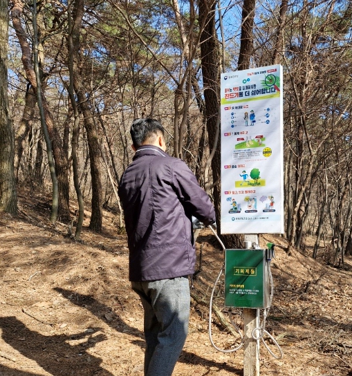 군은 진드기 매개 감염병 예방을 위해 기피제 분사기를 설치 운영하고 있으며, 봄철 등산로 이용 등 주민 사용에 불편함이 없도록 기기 정상 작동 여부를 확인하고 약품을 보충했다.