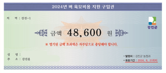 [남도저널 양용숙 기자] 강진군은 농촌의 고령화·부녀화에 따른 부족한 일손을 해소하고 지역경제 활성화를 위해 벼 육묘 비용 구입권을 지난달 28일부터 읍면에 배부하고 있다고 2일 밝혔다.