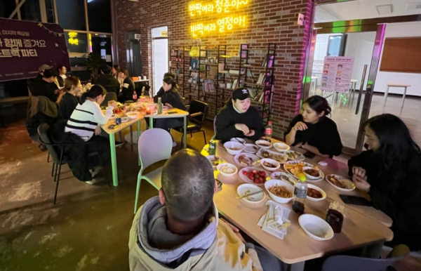 이날 청년숍에는 궂은 날씨에도 불구하고 다양한 배경을 가진 20 부터 40대 청년 18명이 모여 각자가 준비해 온 음식을 나눠 먹으면서 화기애애한 시간을 보냈다.