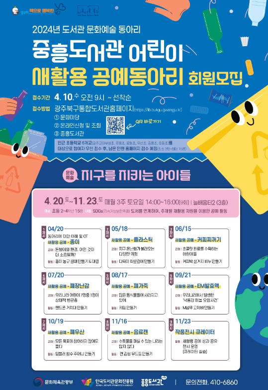 이번 공모 선정으로 중흥도서관에서는 지역 초등학생 대상으로 지속가능발전목표 관련 도서 독서와 주제별 재활용 자원을 소재로 공예 활동을 지원하는 ‘지구를 지키는 아이들’ 동아리가 오는 20일부터 11월 16일까지 매월 세 번째 금요일에 운영된다.