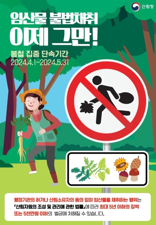 이번 집중단속 대상은 산림 소유자의 동의 없는 두릅, 취나물, 음나무, 고사리 등 임산물 불법 굴·채취를 비롯해 임산물 채취를 위한 수목 훼손 행위, 산림 내 취사 행위 등으로 산불방지 활동과 병행해 추진한다.