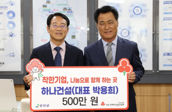 군동면에 위치한 하나건설 박용희 대표는 “국가적으로 가난한 시기를 살아온 세대로 어릴 때부터 논 100마지기를 사서 어려운 이웃들과 함께 나누며 살고 싶었다”며 “강진군을 통해 ‘착한기업’이란 기부 프로그램을 소개받고 가입하게 됐으며, 작은 기부가 큰 사랑이 되어 도움이 필요한 분들께 전달되길 바란다”고 전했다.