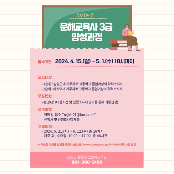 자세한 내용은 담양군청 행정과로 문의 또는 담양군 평생학습정보망 공지사항과 담양군 누리집 공지사항을 확인하면 된다.