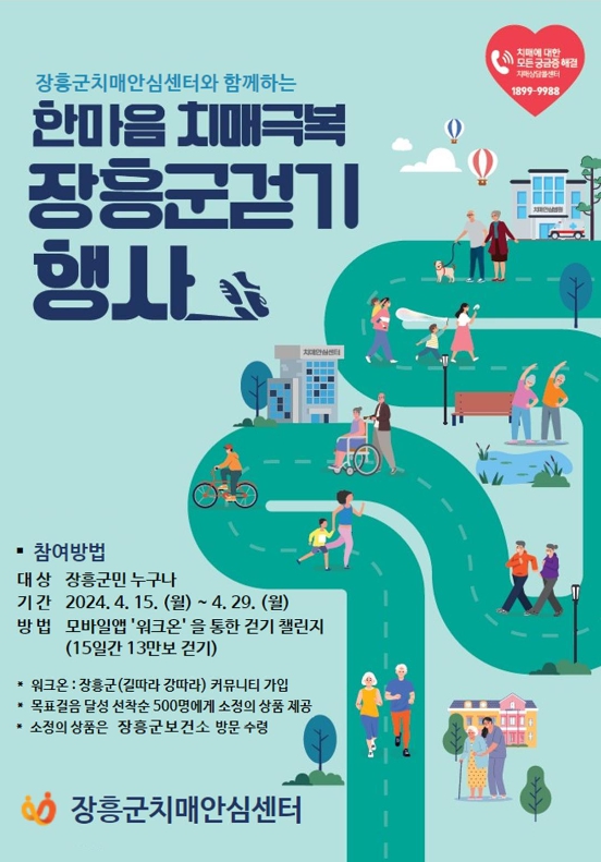 [남도저널 양용숙 기자] 장흥군이 이달 15일부터 29일까지 모바일 앱(워크온)을 활용한 ‘2024년 한마음 치매극복 걷기행사’를 진행한다고 밝혔다.