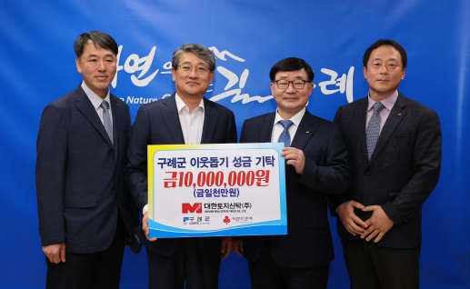대한토지신탁 박종철 대표이사는 “이번 성금이 어려운 이웃에게 조금이나마 도움이 될 수 있기를 바란다”며 “앞으로도 어려운 이웃들의 주거의 질을 높이고 생활환경을 개선하는 등 살기 좋은 구례를 만들기 위해 최선을 다하겠다”고 말했다.